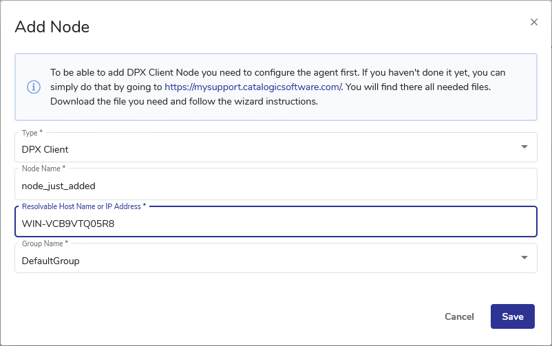 2. Fill in all other required fields: specify the name for the new node, provide a valid resolvable hostname or IP address, and select the group for the node.
