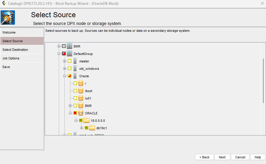 - In the Select Source screen, choose the Oracle databases you want to include in the backup. Click Next.