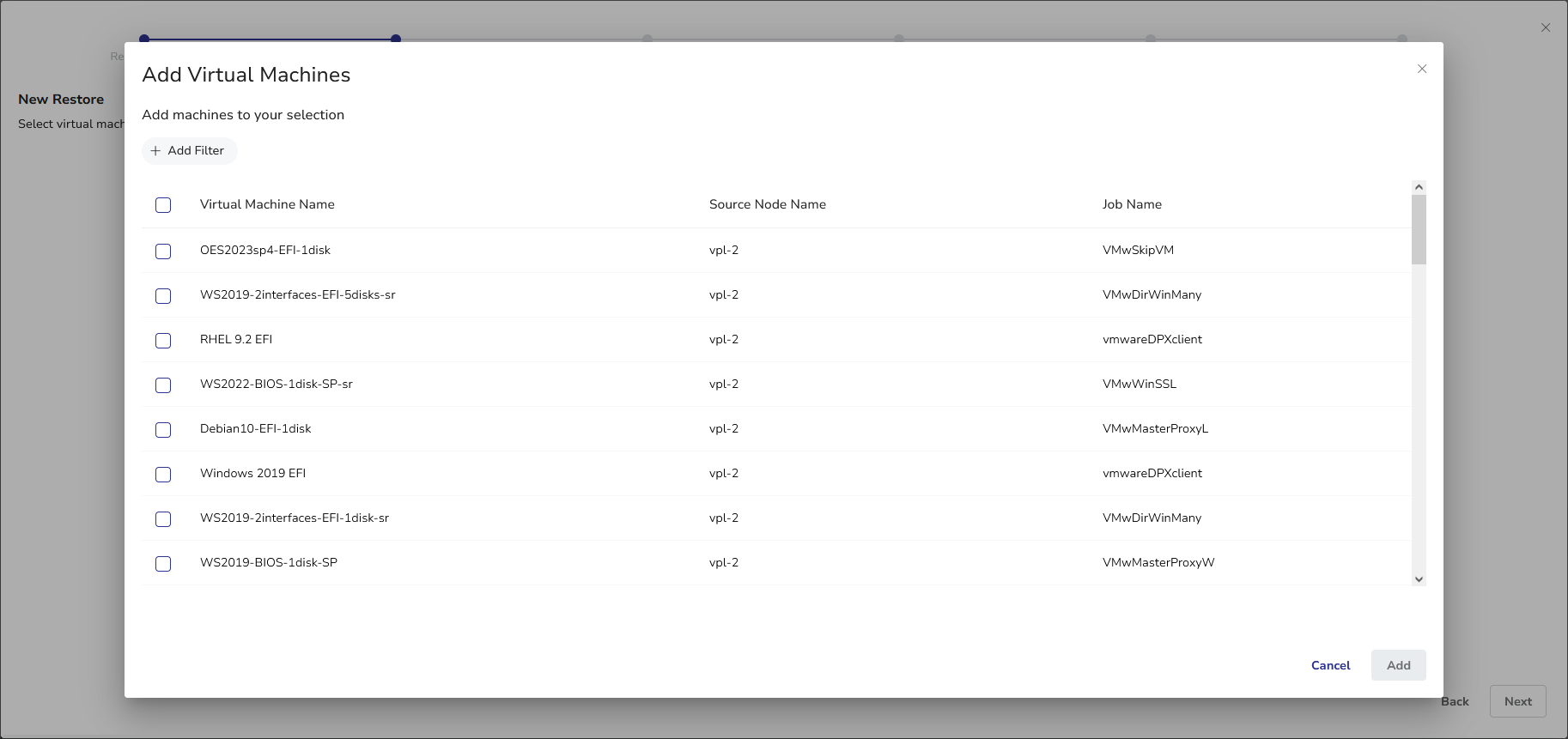 - Select the virtual machines you want to restore and click Add.