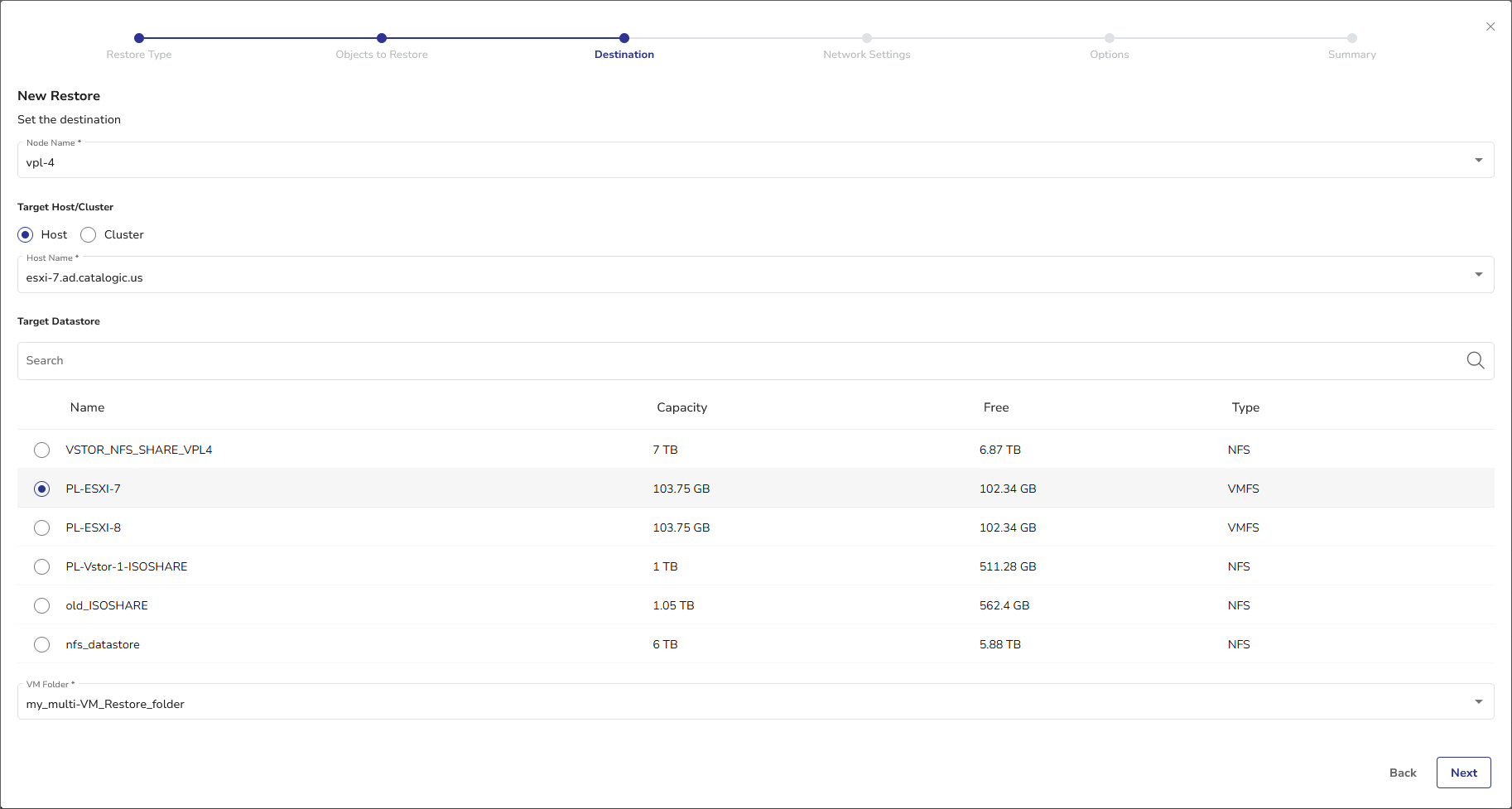 - Select the target datastore from the list. You can narrow down the displayed list by searching by the datastore name, or sort the list by Name, total Capacity, Free capacity or Type.