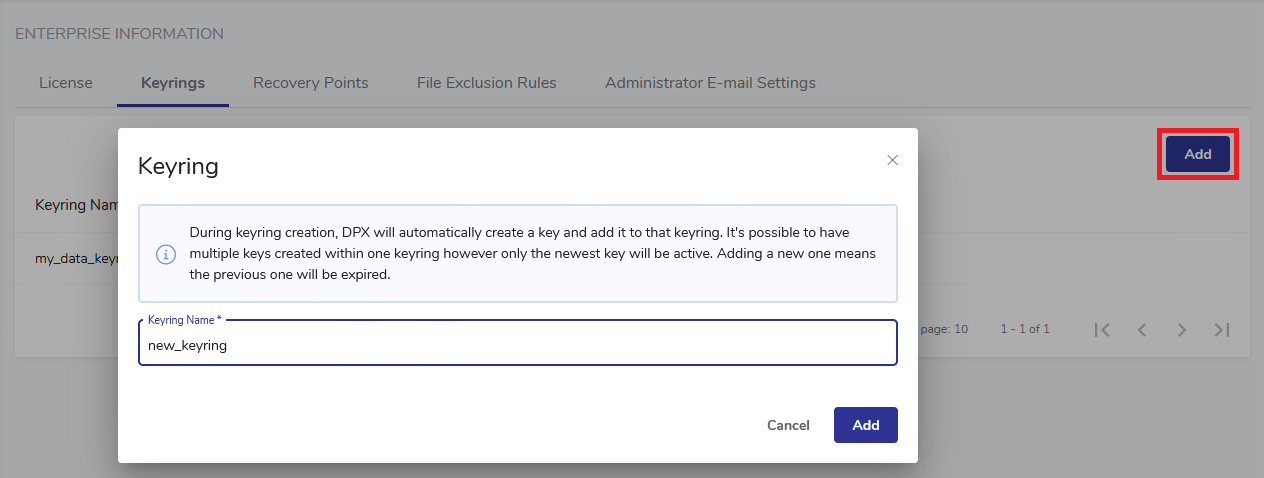 This section lists all keyrings created by the DPX administrator.