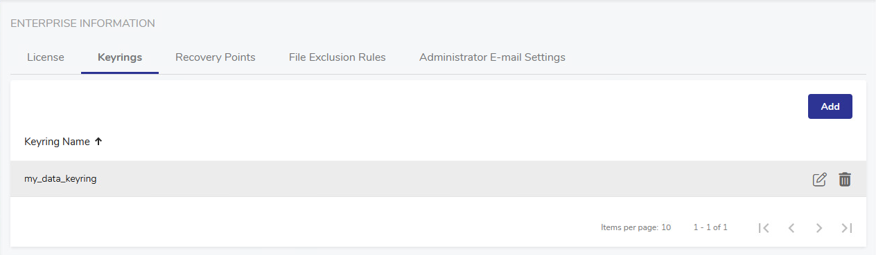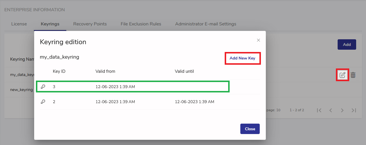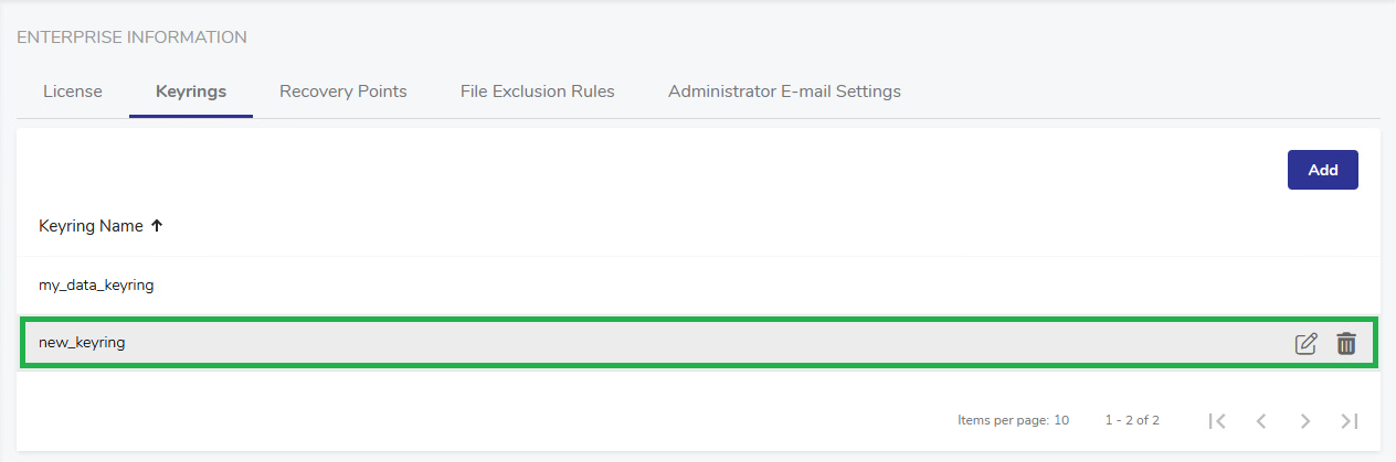 To edit a keyring, hover over the record with the keyring name and click the Edit button on the left.