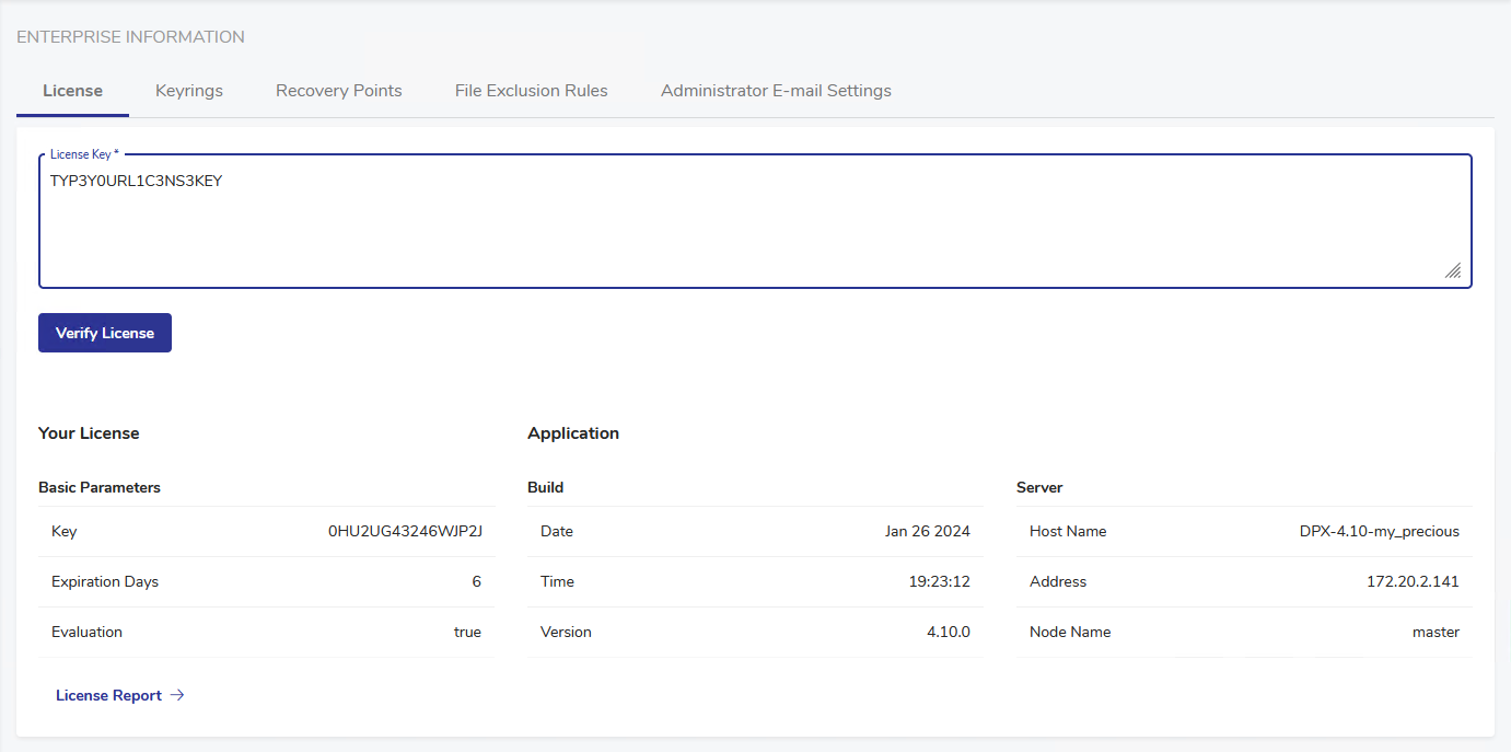 This section contains basic information about your license, including the current license key, the number of days remaining until the license expiry, and whether the key has been evaluated.