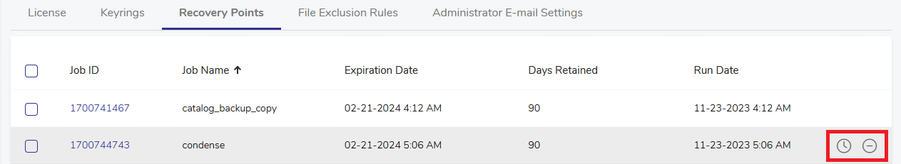 If you hover over a job record, two icons will be shown on the right, allowing to change the retention period or expire the job immediately.