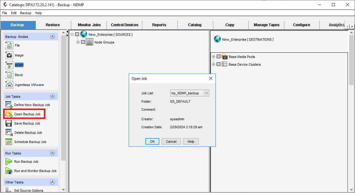 Editing an NDMP backup job allows you to change some parameters of an already defined job (Save), or to create a new job based on the definition of an existing one (Save as…). The procedure is similar to creating a backup job from scratch.