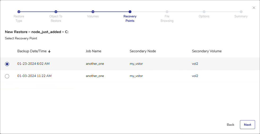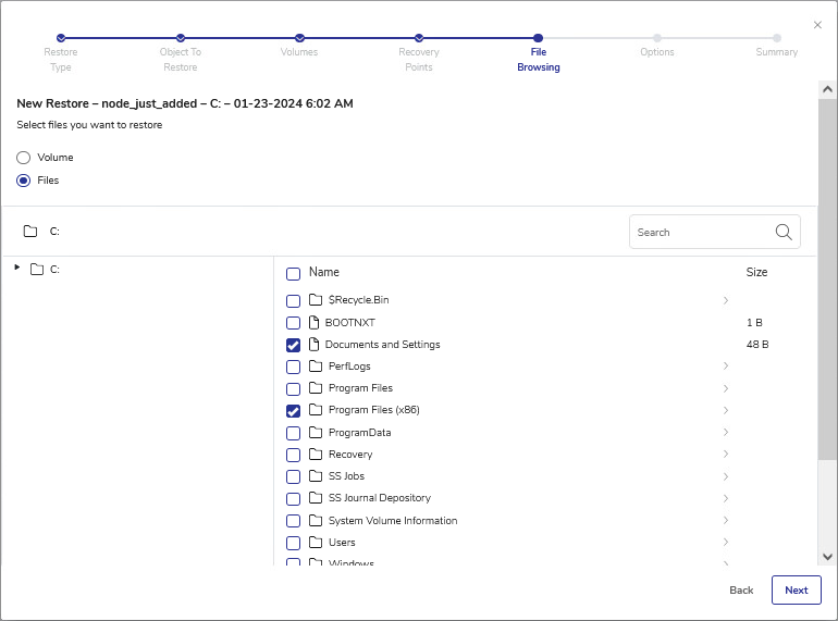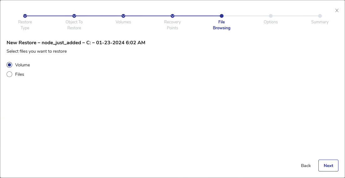 - In the File Browsing step, select either the entire Volume or specific files.