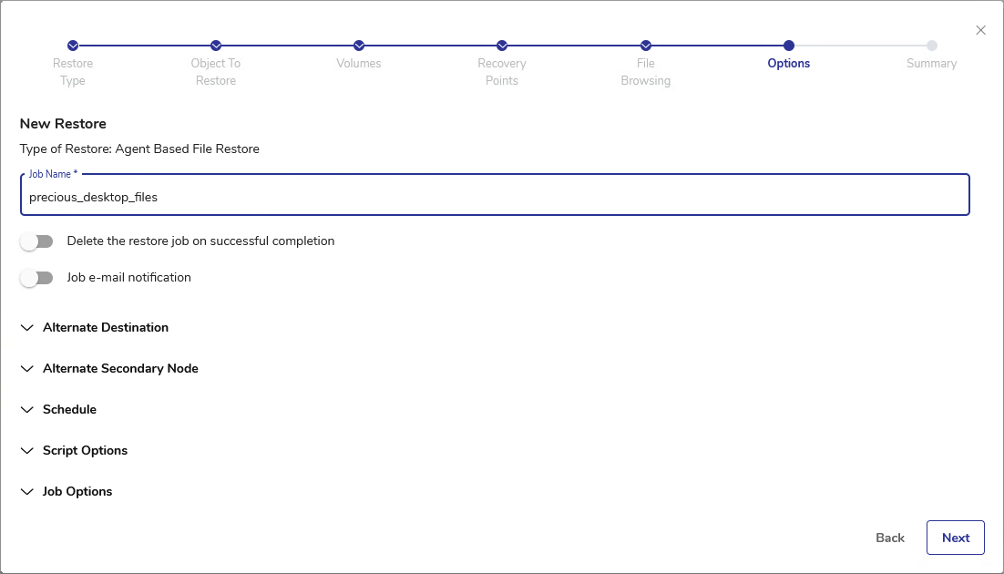 - In the Options step, specify the Job Name. The name may be up to 64 characters long and may only contain letters, digits and