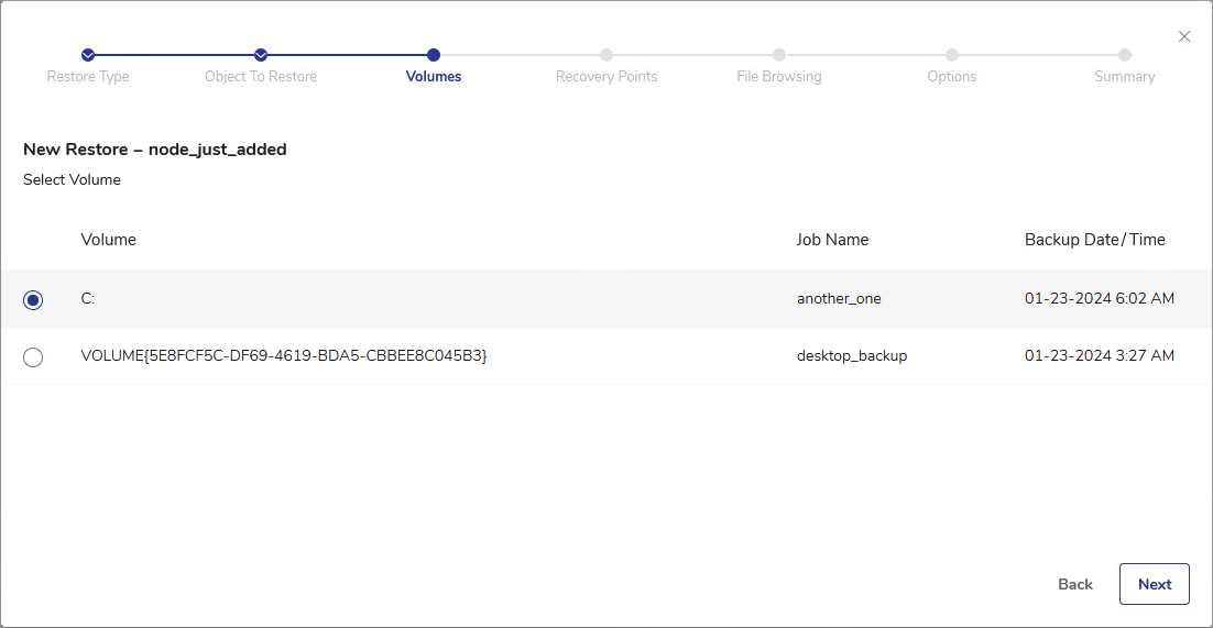 - From the list of volumes within the object, select the volume that contains the files or directories to restore. Click Next.