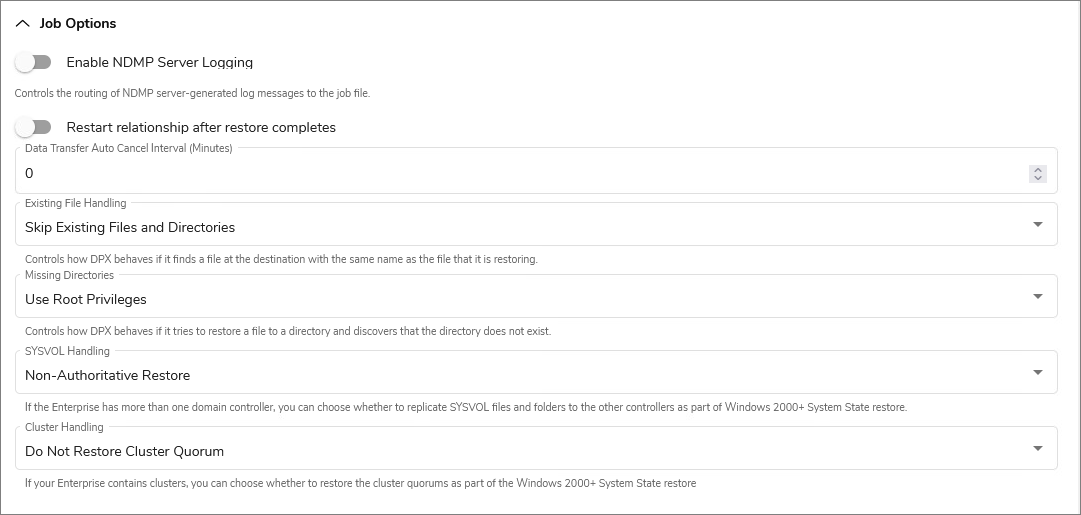 | Toggle on | All NDMP server log messages will be routed to the master server’s job log file. Yes is the default. |