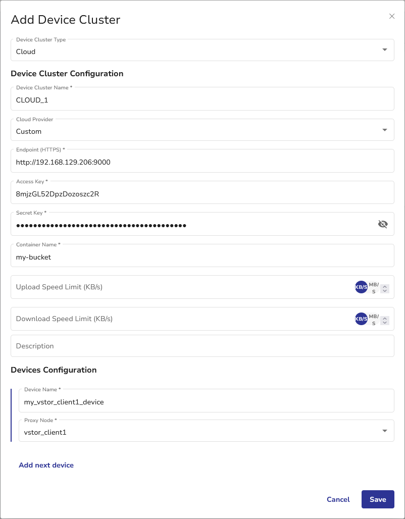 An arbitrary, unique name that you can use to identify your cloud storage item in Catalogic DPX. Device cluster names must be up to 48 alphanumeric characters with no spaces. For example, CLOUD_1. Ensure that none of the device clusters share the same name.