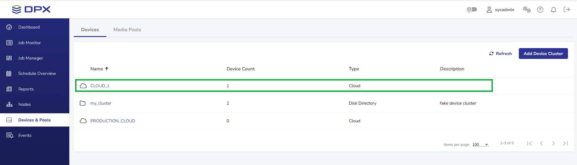 - Go to Devices & Pools in the sidebar. Then select the Add Device Cluster button in the upper right corner to open the Add Device Cluster dialog.