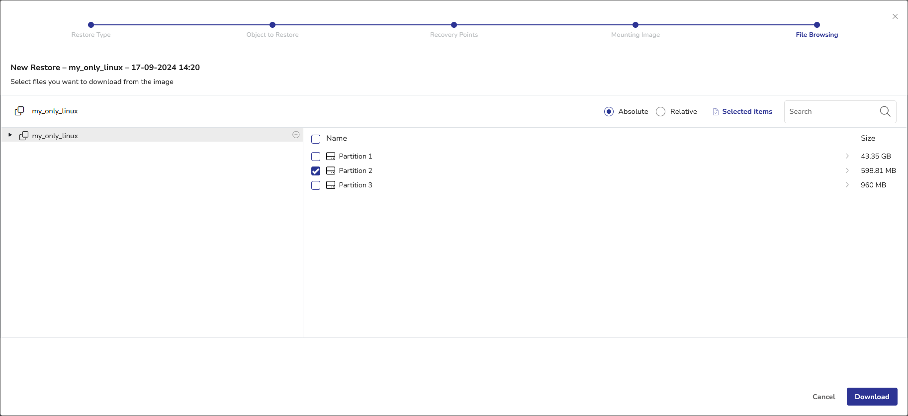 The Browse button or the Browse option in the context menu under the right-click will take you to the final step of the Agentless File Restore workflow where you can select individual files or entire folders to restore. They will be downloaded as