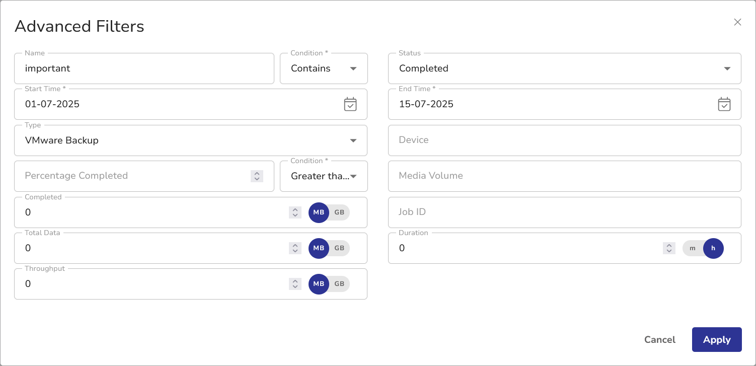 The Job Monitor tab default view displays all jobs matching the default timeframe filters for the current day. You can customize the view using the Advanced Filters button.