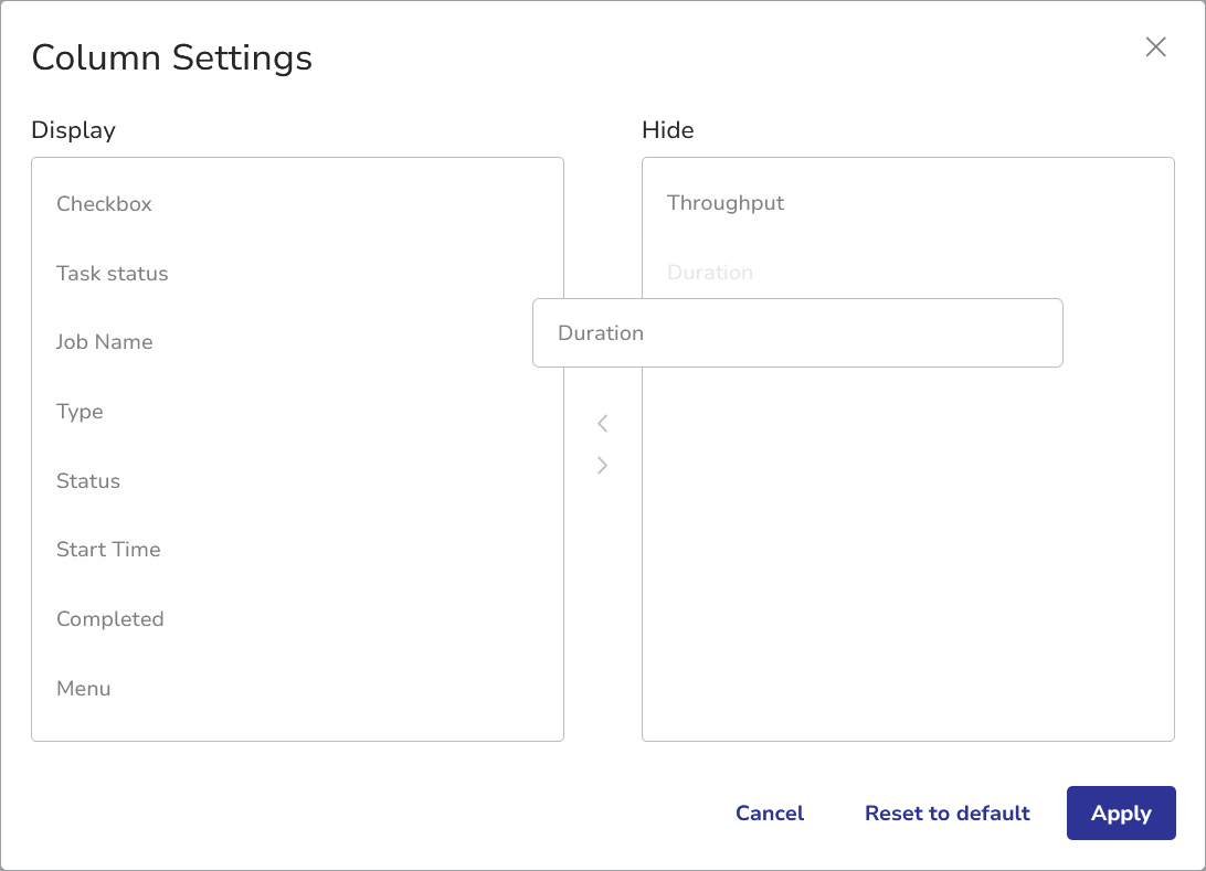 Drag and drop column headers to hide or unhide them and change the column orders. Default display settings can be restored using the Restore to default button.