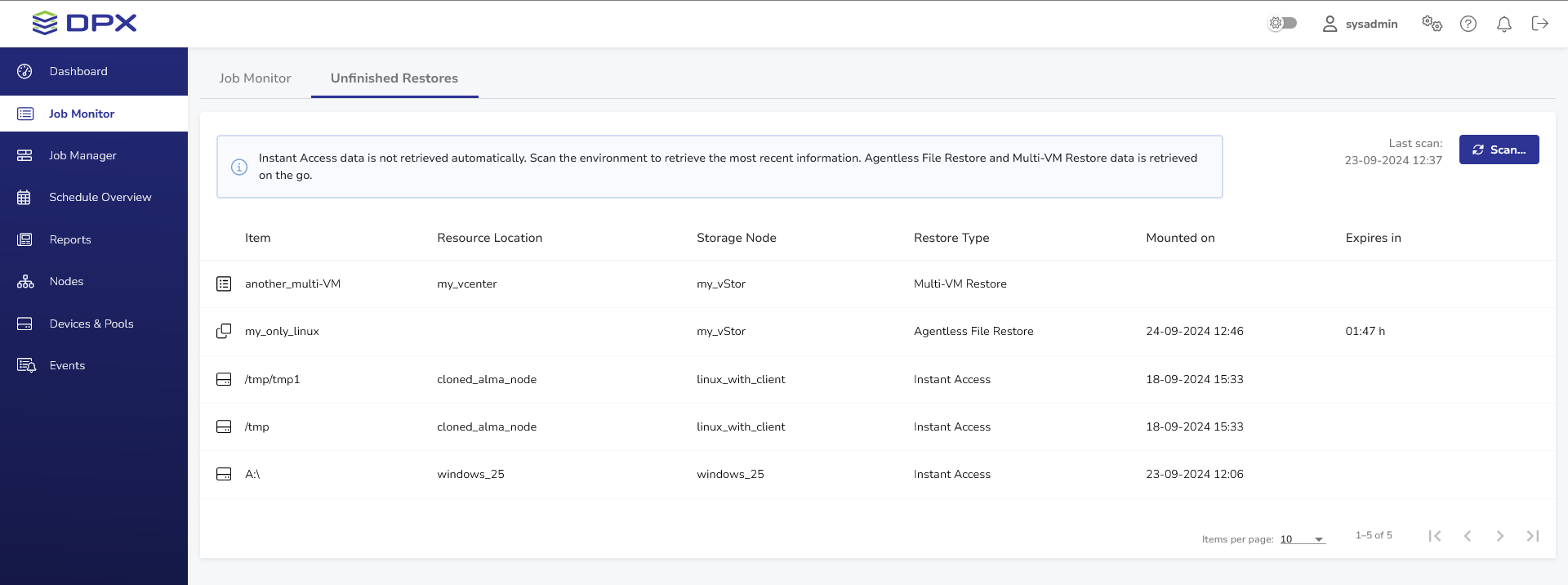 The Job Monitor view consists of two tabs: the traditional Job Monitor tab and the Unfinished Restores tab.