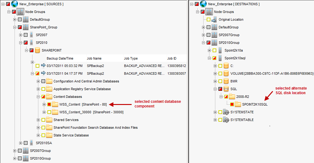 - You can individually select a SharePoint application’s content database component (or one of its sub-components) and restore it to an alternate SQL disk location, as shown in the following illustration: