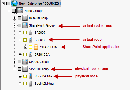 Because a node in an Enterprise is always a member of a group, add new SharePoint physical nodes to the Enterprise using a specific node group association. Although it is not specifically required, it is recommended that you use the management console to create a new dedicated SharePoint physical node group for the SharePoint application. For instructions on adding a node group to the Enterprise, see Adding a Node in the Reference Guide.