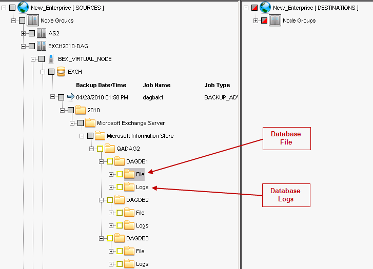 For DAGs, the physical nodes can also be browsed for backup instances, but Microsoft Exchange Server components are not available for restore. Microsoft Exchange Server components are only displayed under the virtual node.