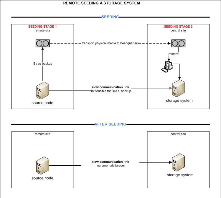 For remote data protection (for example, of a branch office) it can be a challenge to perform an initial base backup if the source primary system contains a large amount of data and is to be backed up over a slow communication link.