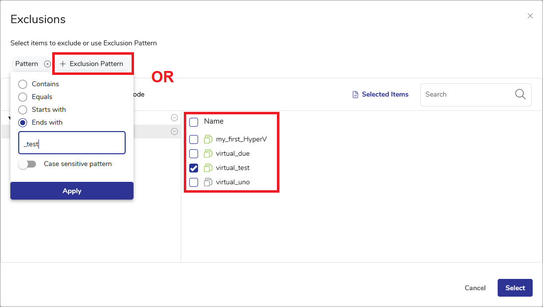 - Use the EXCLUSIONS pane to exclude certain machines within a Hyper-V node. You may exclude individual machines by selecting them within the tree view in the Exclusions dialog or use exclusion patterns for a series of machines within an entire Hyper-V node selected as a Source.