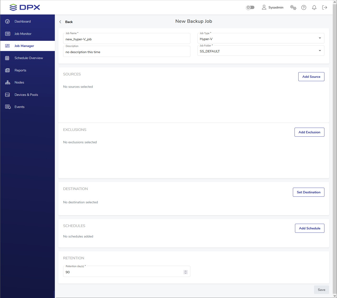 - Select Job Type – Hyper-V and the Job Folder to store the job in (see the Job Manager section for more information). By default, all jobs are stored in the SS_DEFAULT job folder.