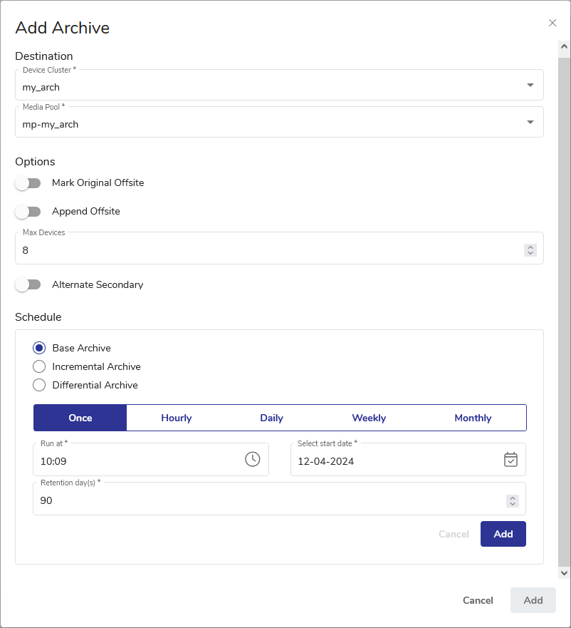 - When all schedules are set, click Add at the bottom of the Add Archive dialog.