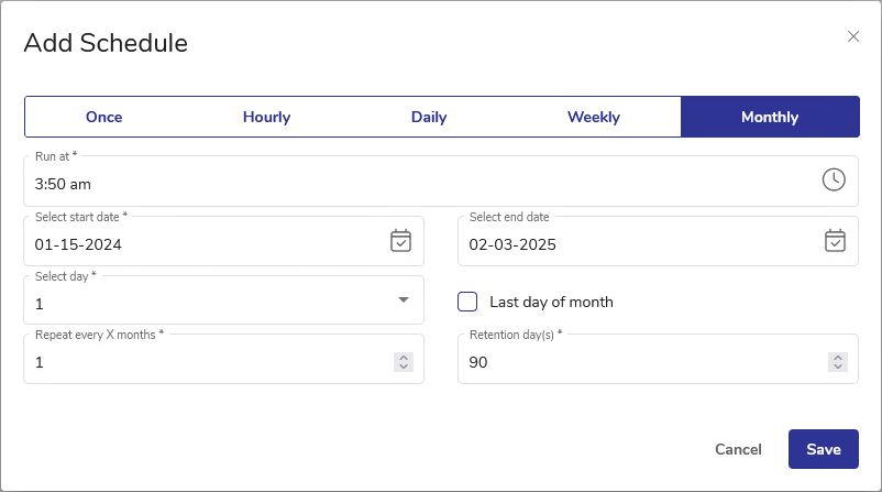 The dialog will display slightly different parameters depending on the selected frequency. Below is the Monthly schedule view.