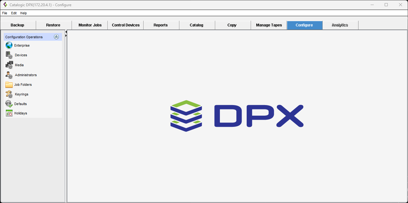 Use the Configure operations to define new resources and default options to Catalogic DPX. After initial configuration, use the Configure functions to display and modify your defined resources. In the Configure tab, you can open the following pages from the task panel: