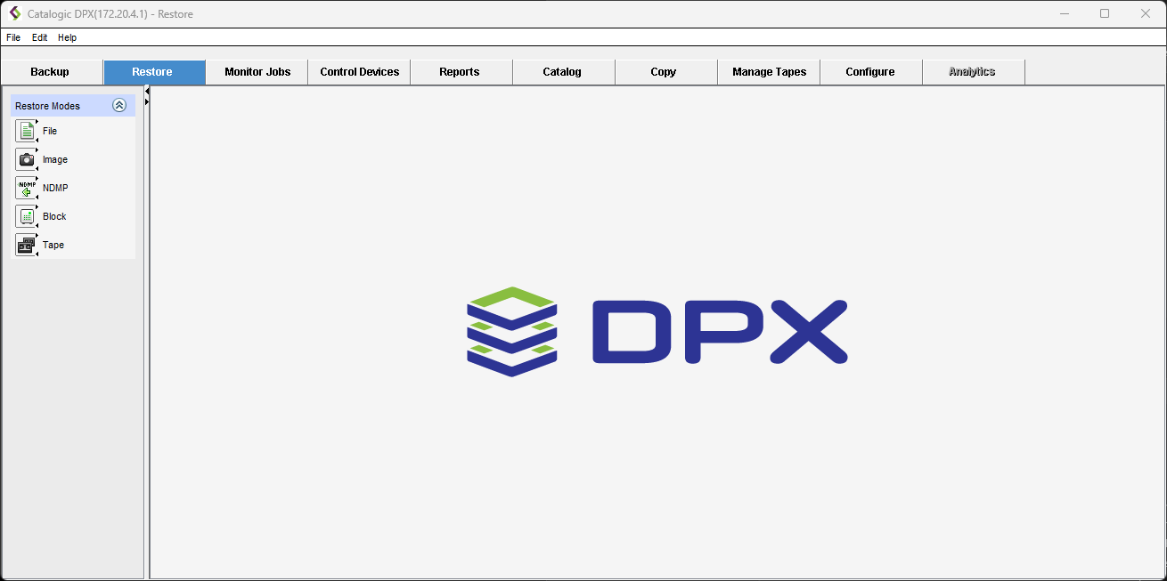 Restores data from a Block Backup. Block restore also supports Instant Access and other features of the Catalogic DPX Block Data Protection.