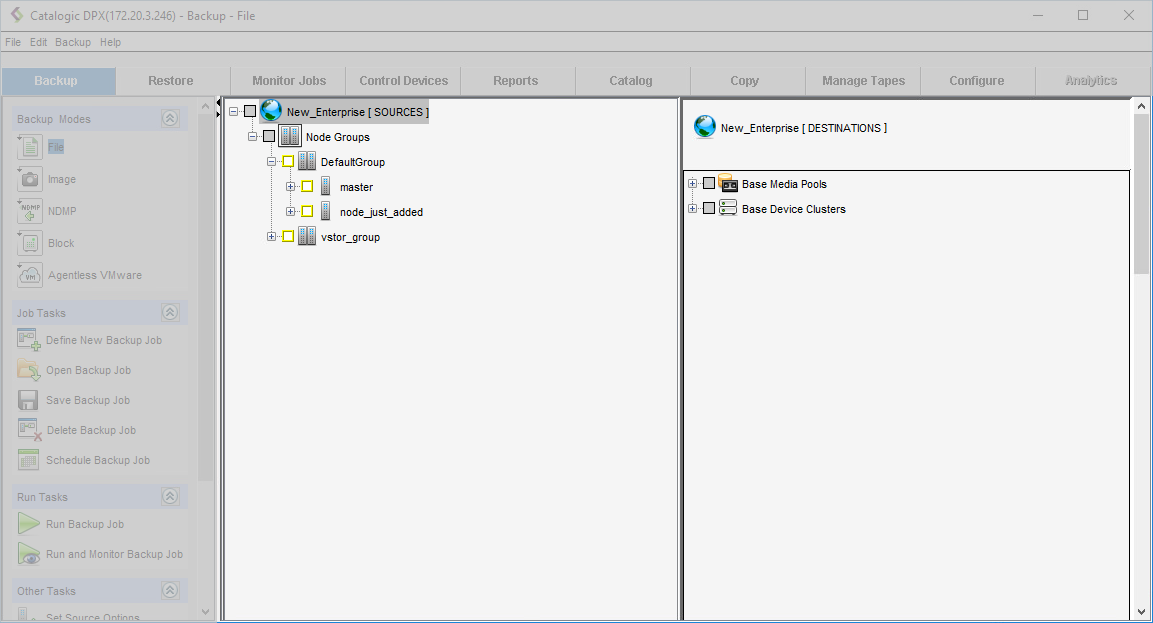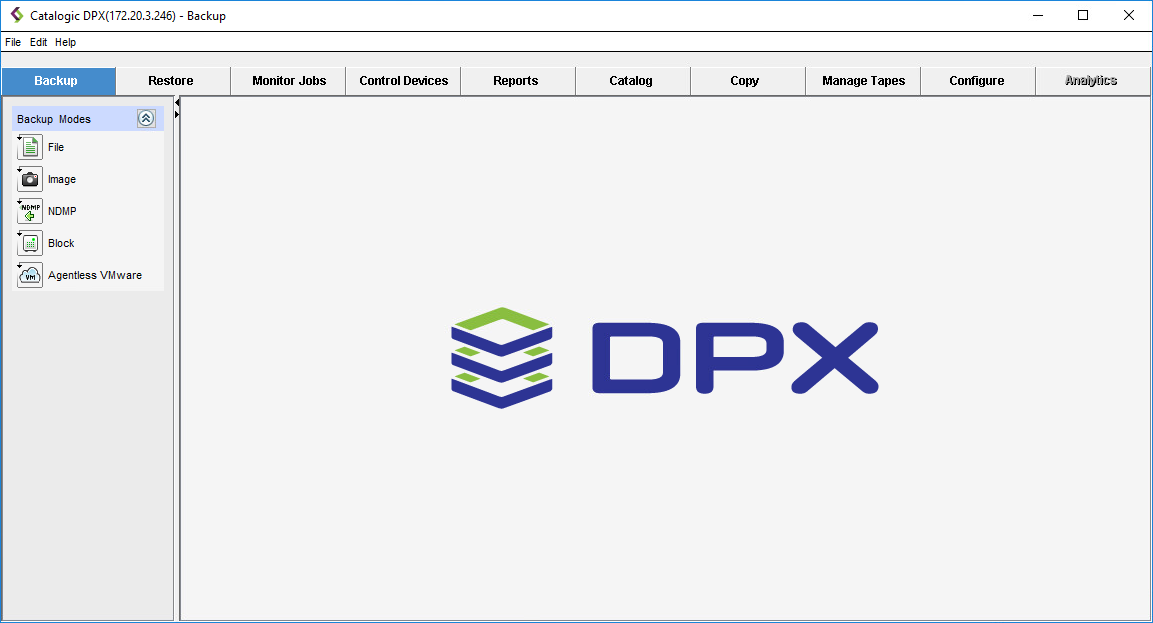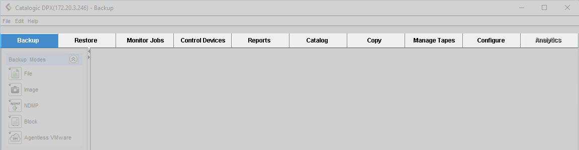 These tabs are Backup, Restore, Monitor Jobs, Control Devices, Reports, Catalog, Copy, Manage Tapes, Configure, and Analytics. The Analytics tab is now deprecated and therefore it has been disabled.