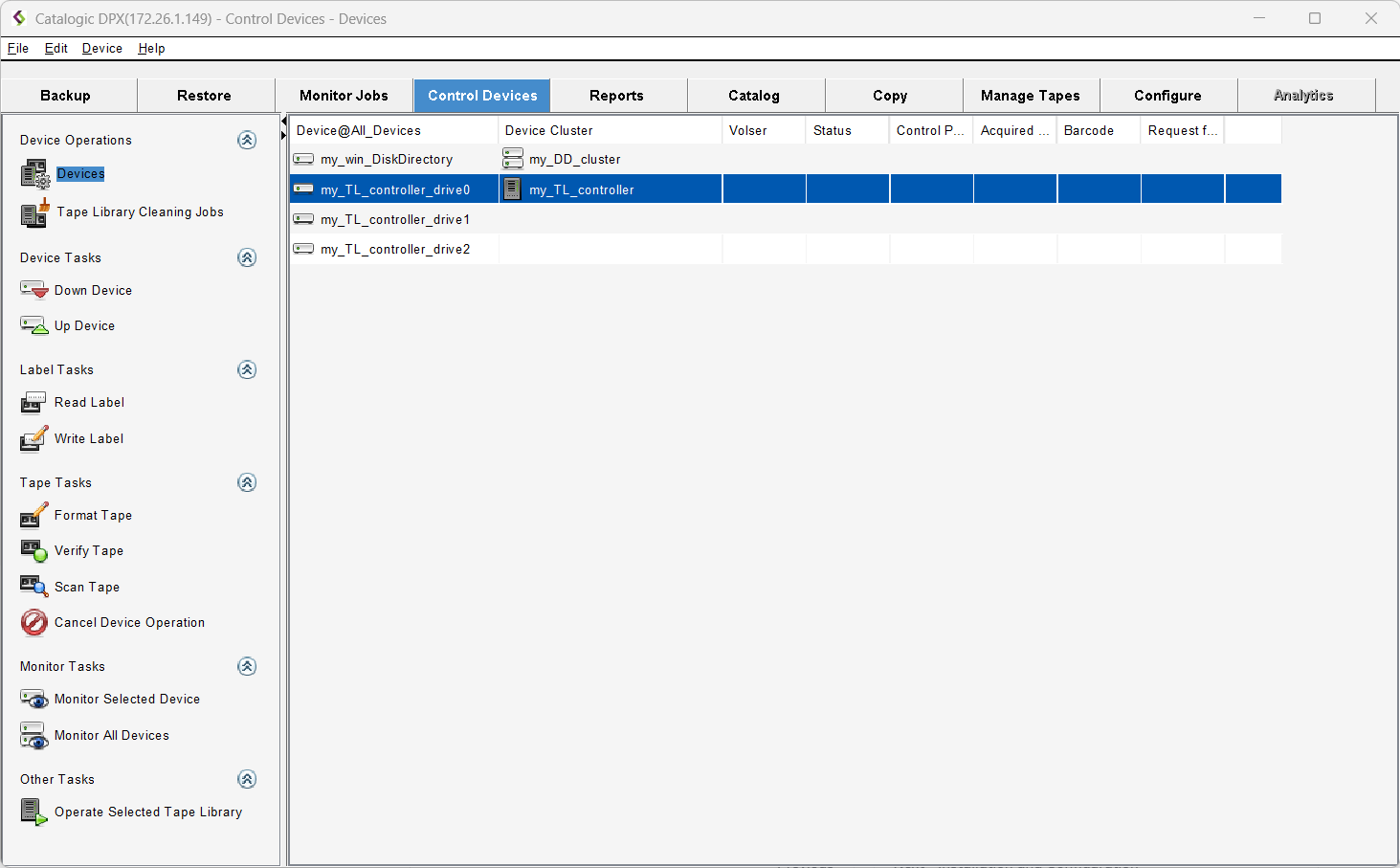 The Control Devices resource tree displays the hierarchical structure of the device clusters, tape libraries, and devices.+ Enterprise