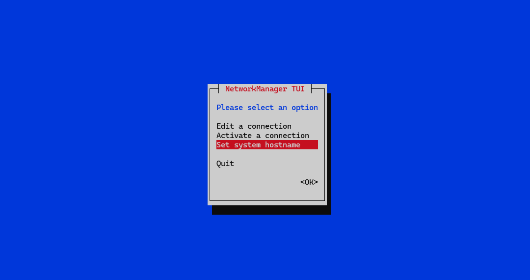 nmtuicommand to open the NetworkManager Text User Interface to modify the DPX Master Server appliance’s hostname or IP address to match what was previously set in the DNS.![[image expected here]](/assets/images/networkmanager_tui-home_screen_1-57d1324966cca3afdd4cca50fb770b6b.png)