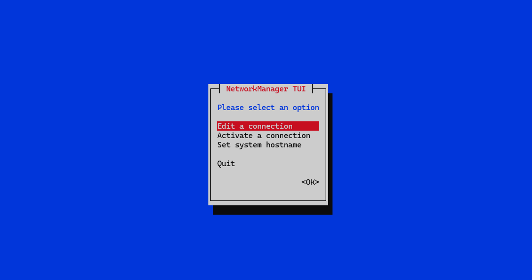 On the NetworkManager Text User Interface, use the arrow keys to navigate. Select Edit a connection and press Enter. Under Ethernet, select the interface (e.g. eth0) to modify. Navigate to Edit... and press Enter.
