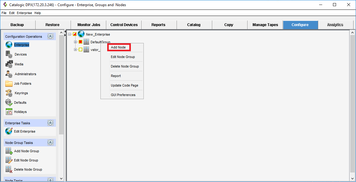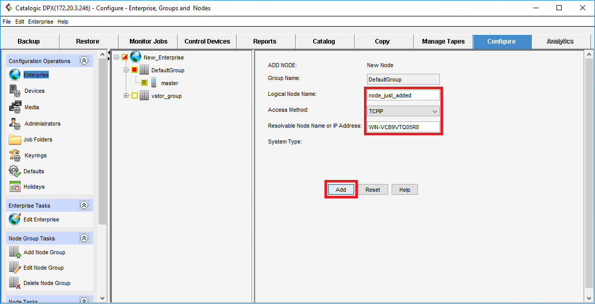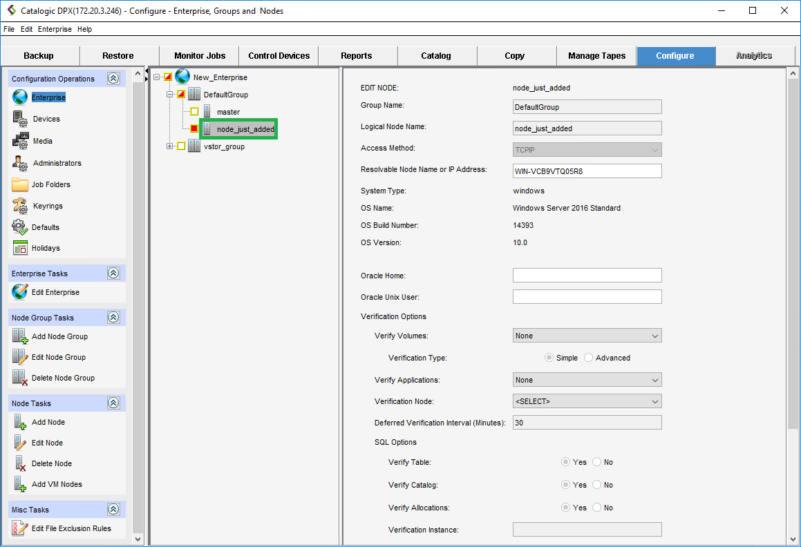 The node is now added. You can see it in your Enterprise tree, and its parameters are visible in the EDIT NODE pane.