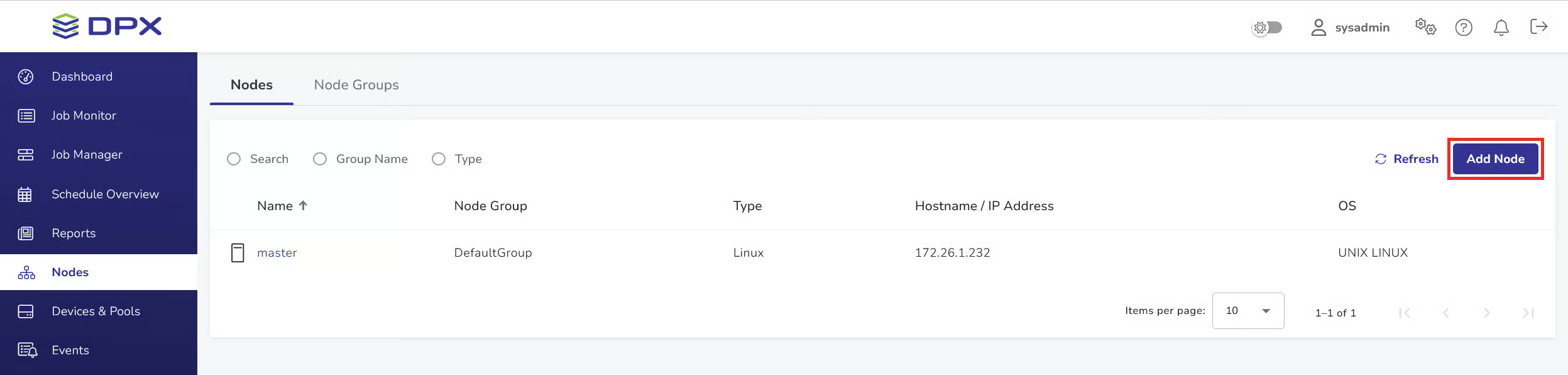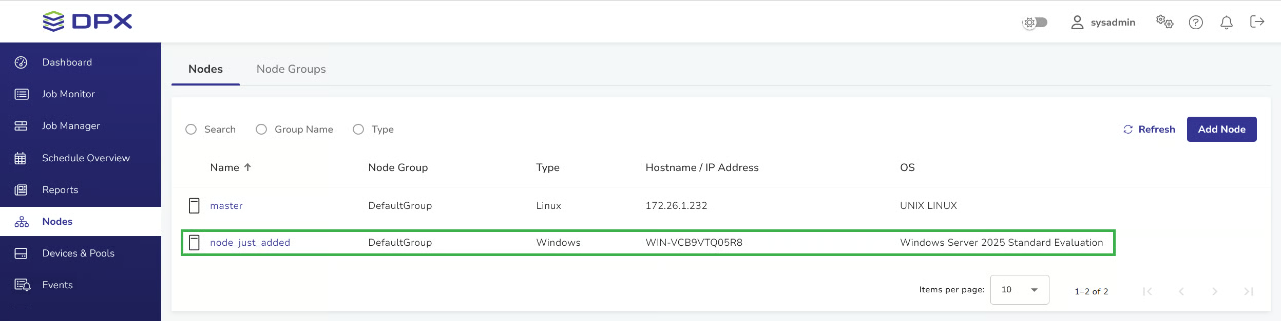A list of all nodes added to the DPX Master Server will be shown.