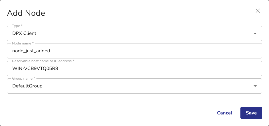 Select the node Type: DPX Client. For other node types, see Adding Other Node Types to the Master Server. - Fill in all other required fields: specify the name for the new node, provide a valid resolvable hostname or IP address, and select the group for the node.
