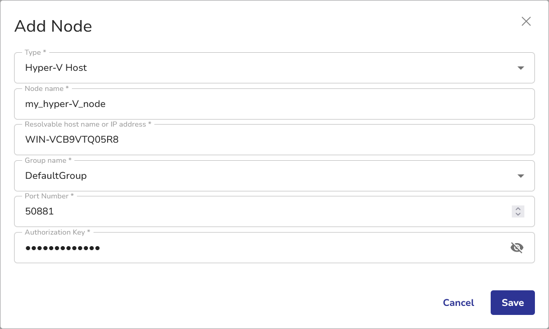 - Select Hyper-V Host as type. Specify the name for the new node (it must be unique throughout the Enterprise), provide a valid resolvable hostname or IP address, and select the group for the node.
