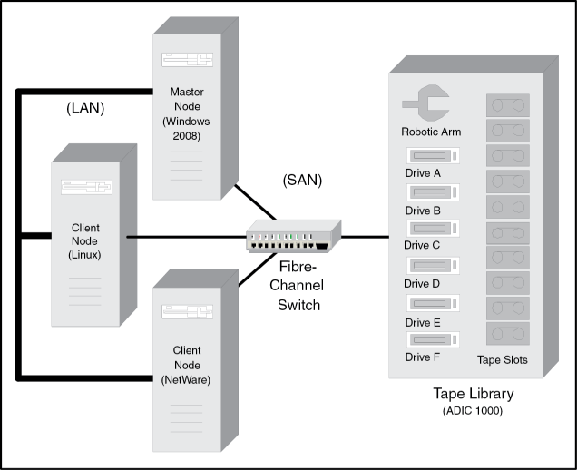 The following is a sample session of the Device Configuration Wizard for illustrative purposes. This sample session sets up a SAN with three heterogeneous servers and one six-drive tape library, as depicted in the following diagram: