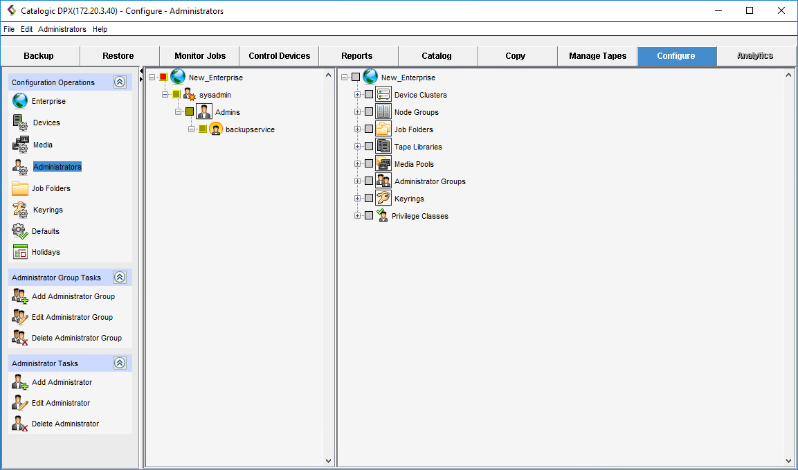 To launch the Configure Administrators window, click the Configure tab on the Function Tab bar of the window, then click Administrators in the task panel.