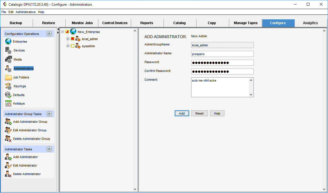 The Add Administrator dialog appears in the right pane of the Configure Administrators window.\