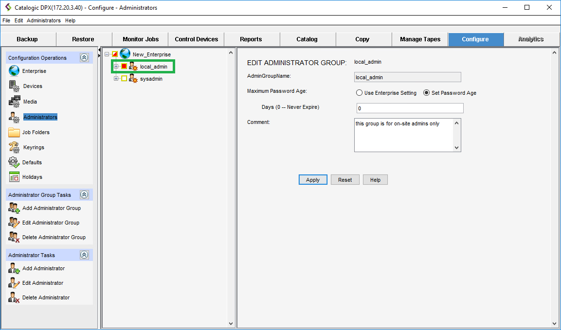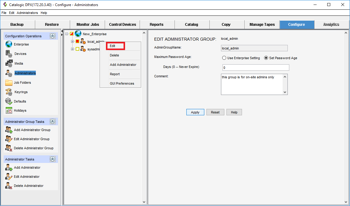 - From the menu bar, select Administrators > Edit Administrator Group.