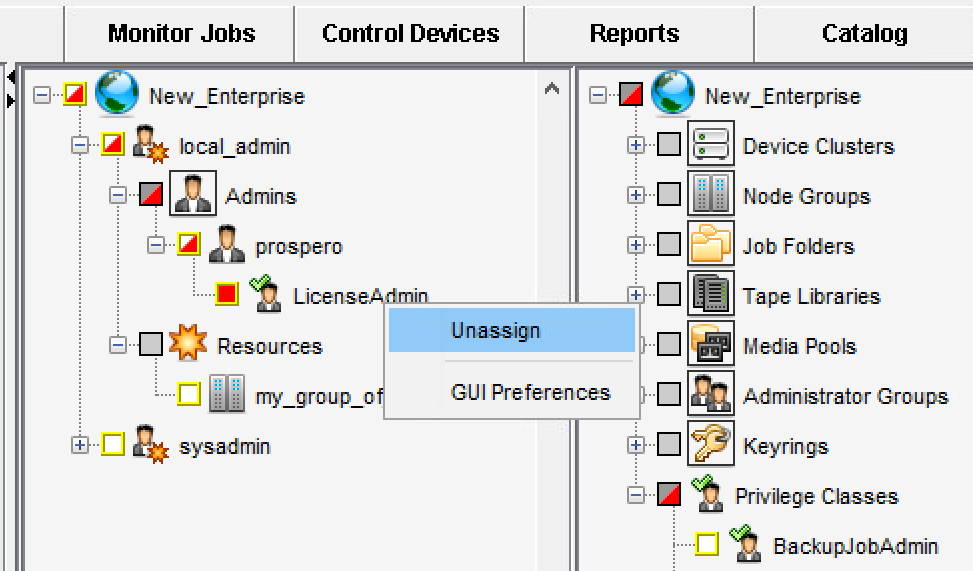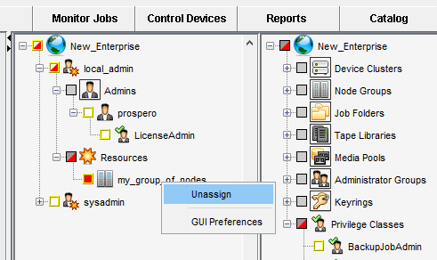 - Right-click the assigned privilege class to display a context menu. The selection is indicated by the selection check box next to the assigned resource icon. Then select Unassign.