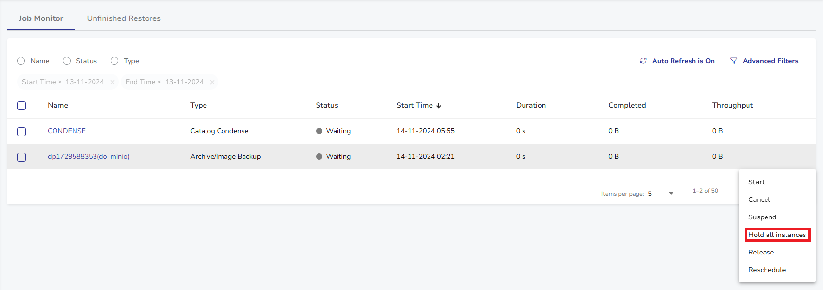- Right-click the job record or click the More Actions ⋯ button and select Hold all instances.
