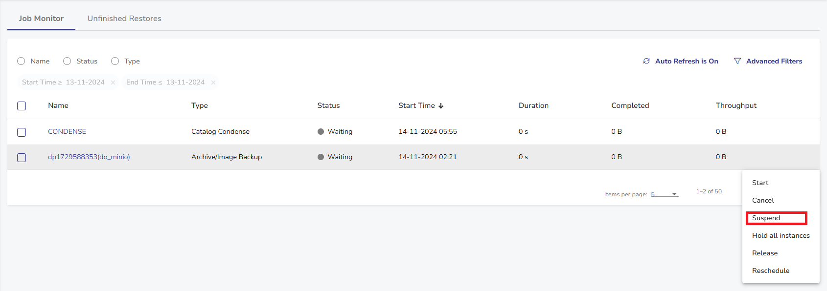 Unlike Hold, Suspend can pause a running job, and acts on a single instance of a backup job, whereas Hold acts on all instances. See Holding and Releasing Scheduled Jobs.