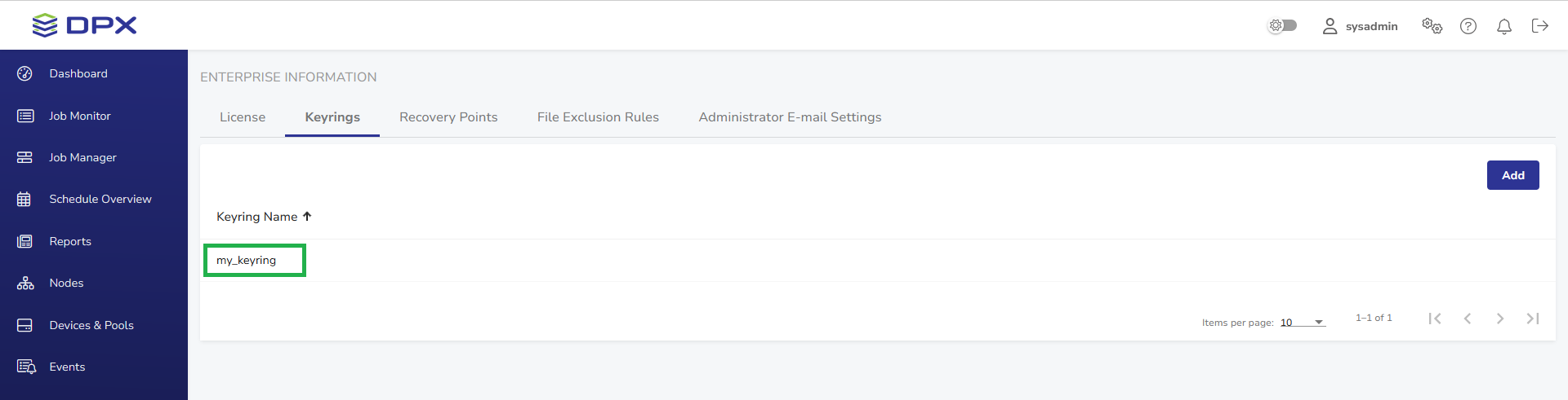 The tab lists all keyrings created by the DPX administrator.