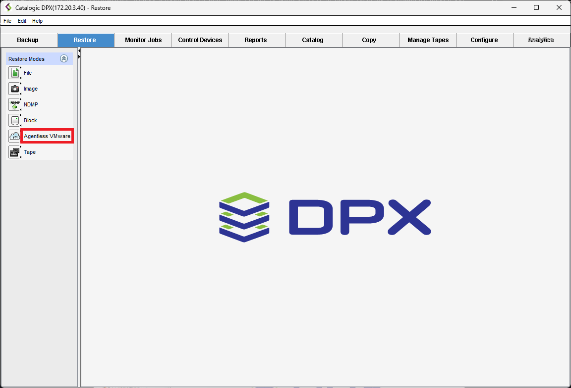 - Navigate to the Restore tab in the main desktop interface window. From the Restore Modes section in the task panel, select Agentless VMware.