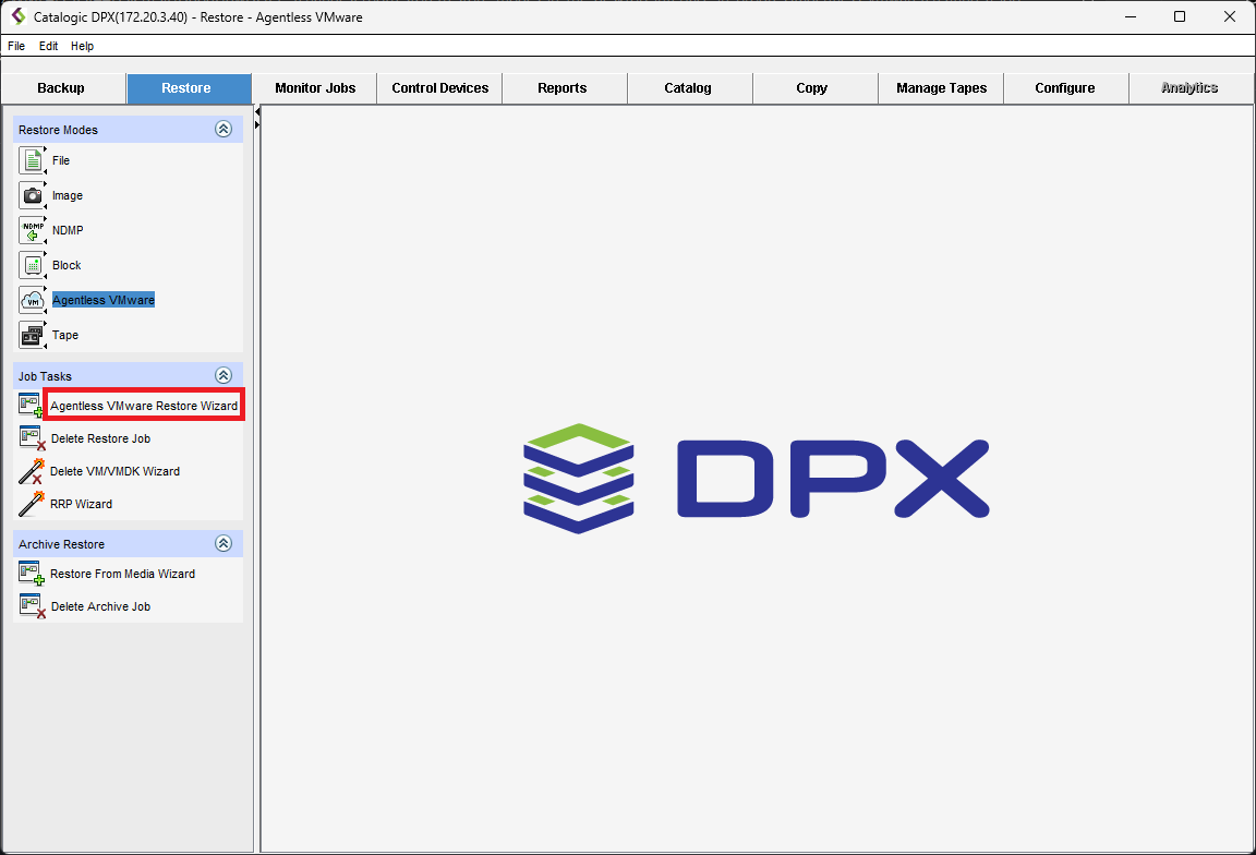 - To create a new Agentless VMware Restore Job, select Agentless VMware Restore Wizard.