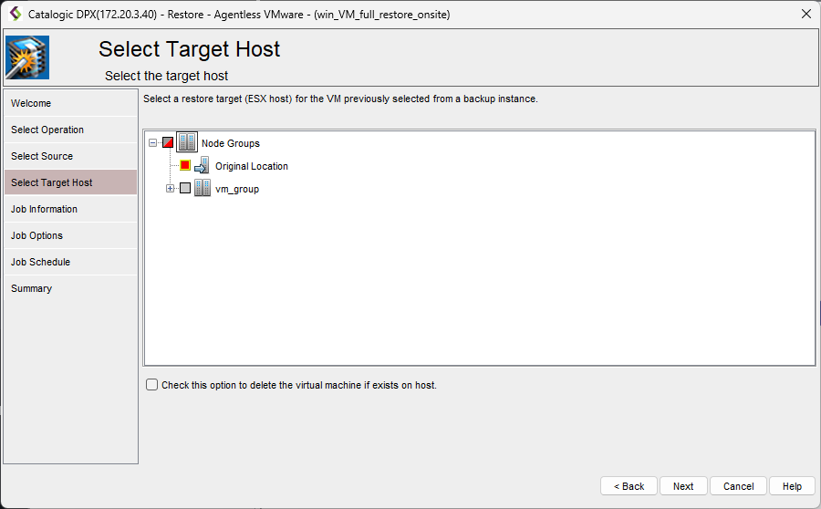 If the option Check this option to delete the virtual machine if it exists on the target host is checked, the VM is deleted if it is not part of a resource pool. However, if the VM is part of a resource pool and this option is checked, the restore job will fail.