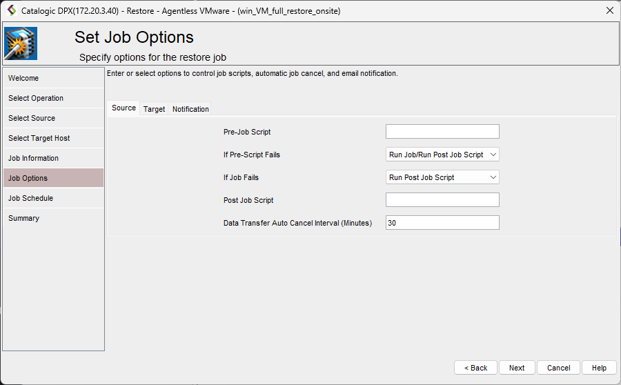 - Set up pre-job and post-job scripts, disk provisioning, and notifications. For more detailed information on each available field and tab, see the tables below: