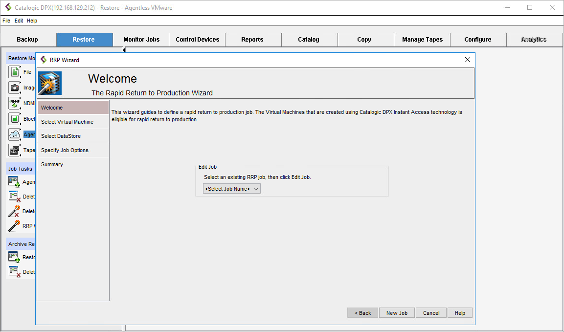 Rapid Return to Production (RRP) creates a full production VM from an existing VM created with Instant Virtualization from Block Backups or Instant VM Restore from Agentless Backups. RRP transfers data from a snapshot on secondary storage to primary storage attached to an ESX server. The new production VM is available for use within minutes while data transfer continues transparently in the background. RRP jobs are defined through the RRP Wizard. RRP jobs can be scheduled, but they are intended for single, not recurring use.
